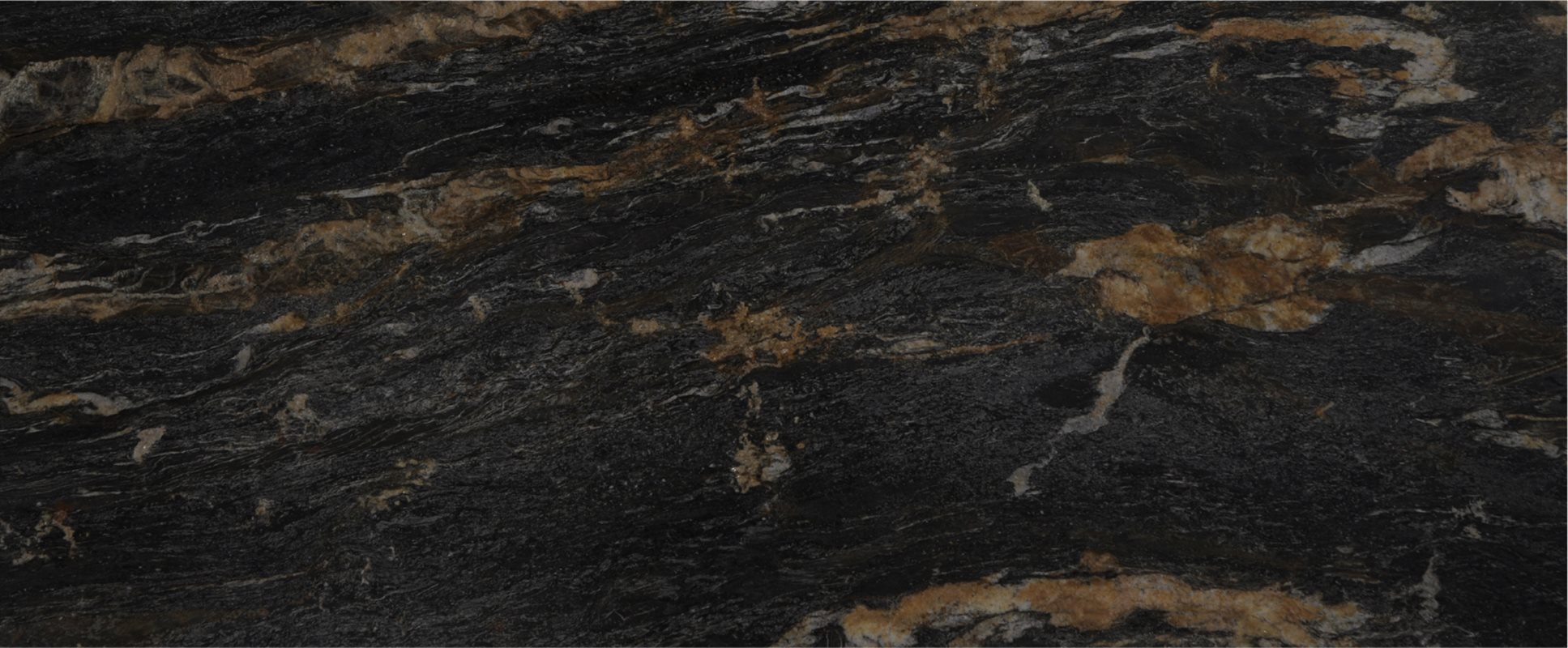 گرانیت Infinity Gold بافتی پویا و پرانرژی دارد. بر روی زمینهای از مشکی و خاکستری تیره، امواج و لکههایی به رنگ طلایی، برنزی و نقرهای در هم آمیختهاند. این سنگ با الگوی پیچیده و کیهانی خود، حسی از حرکت بیپایان و تجمل را القا میکند و برای ایجاد یک نقطه کانونی خیرهکننده در فضاهای لوکس عالی است.