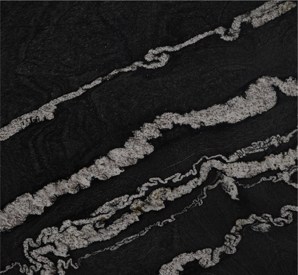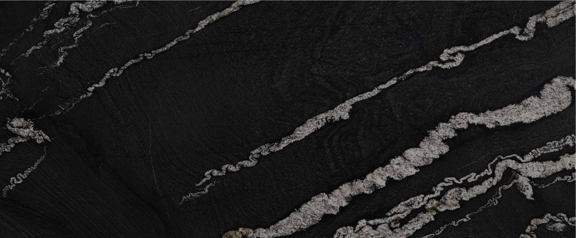 گرانیت Titanium با تضاد رنگی قوی و رگههای برجسته خود، یک انتخاب جسورانه است. زمینهی مشکی عمیق و بافتدار آن، بستری برای رگههای مواج و کریستالی به رنگ سفید، نقرهای و رگههای ظریف طلایی فراهم میکند. این الگوی قدرتمند، حسی از انرژی خام و لوکس بودن را به فضا میبخشد و برای دیوارهای شاخص یا جزیرههای آشپزخانه ایدهآل است.