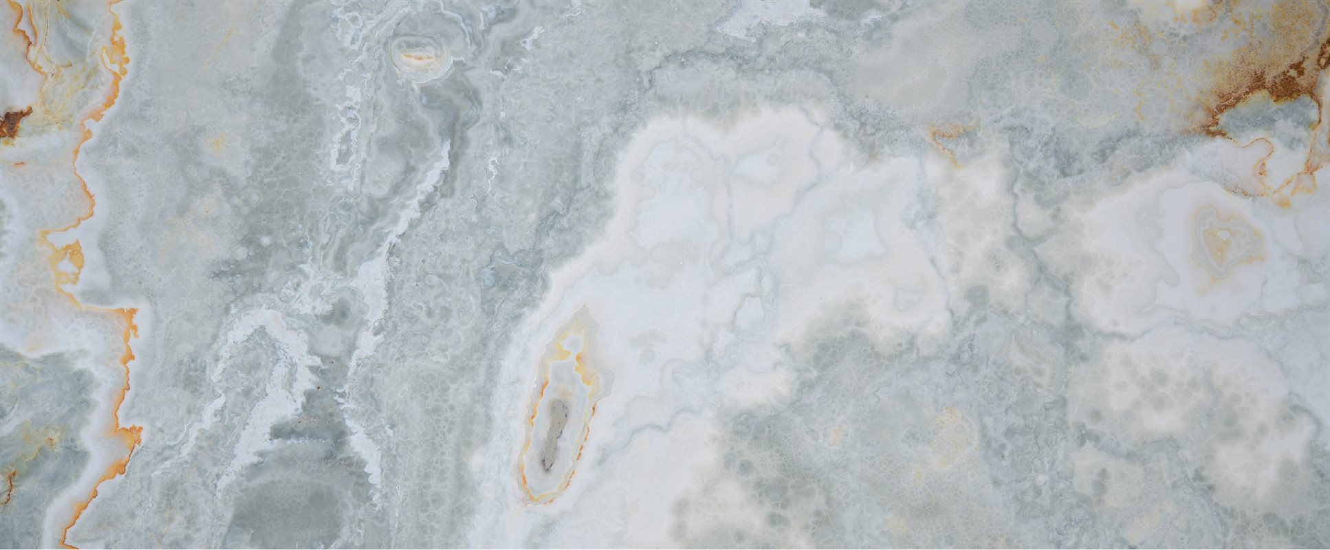 اونیکس آبی سنگی دراماتیک با زمینهی نیمهشفاف به رنگ آبی-خاکستری دودی است. الگوهای ابریشکل سفید و رگههای درخشان طلایی-قهوهای، تضادی خیرهکننده ایجاد میکنند. قابلیت عبور نور در این سنگ، به ویژه در کنار رگههای طلایی، به آن عمق و جذابیتی سینمایی میبخشد و آن را برای دیوارهای شاخص با نورپردازی از پشت ایدهآل میسازد.
