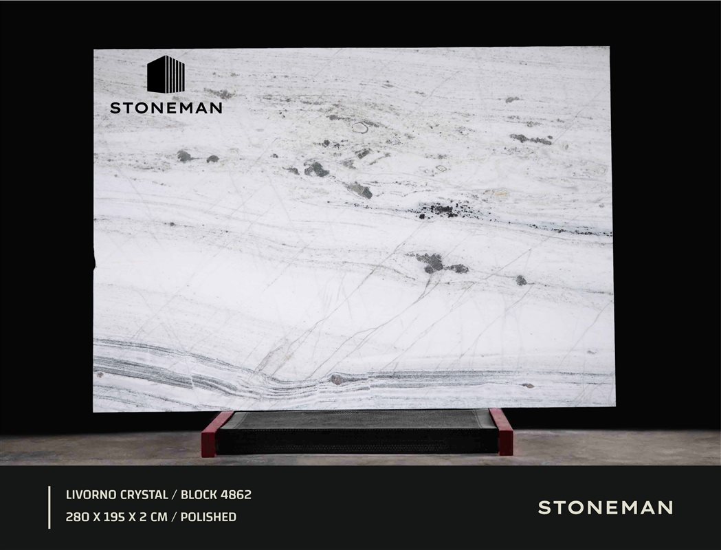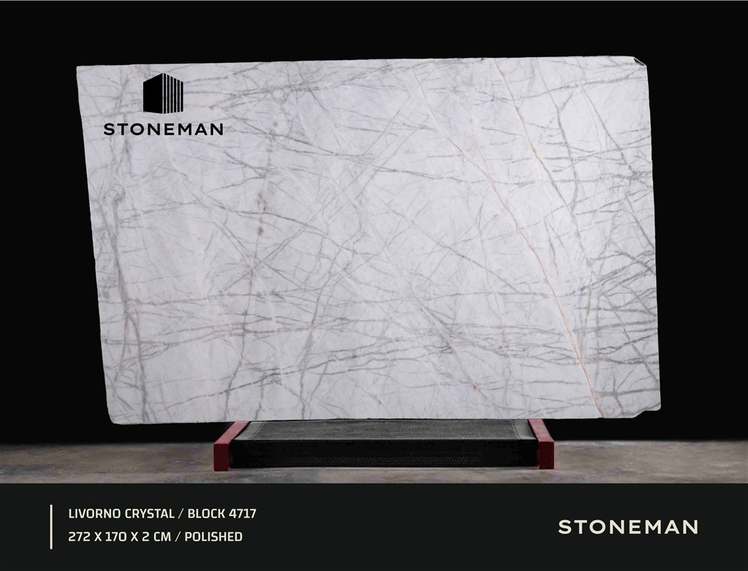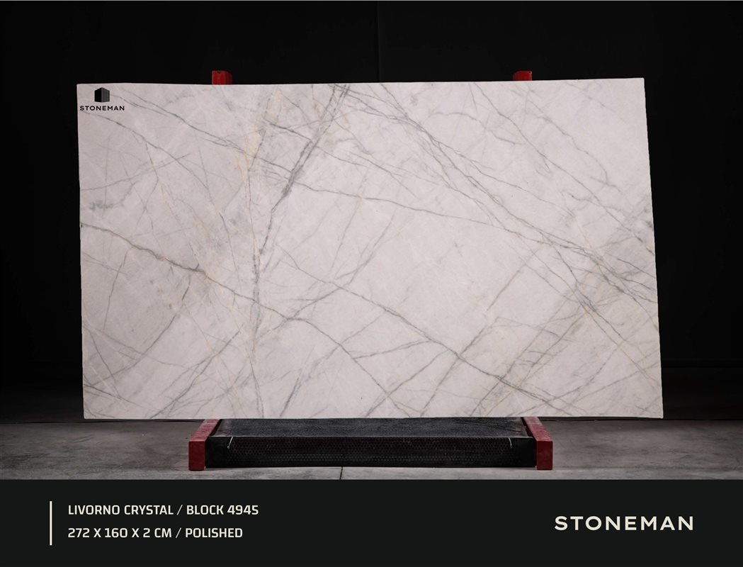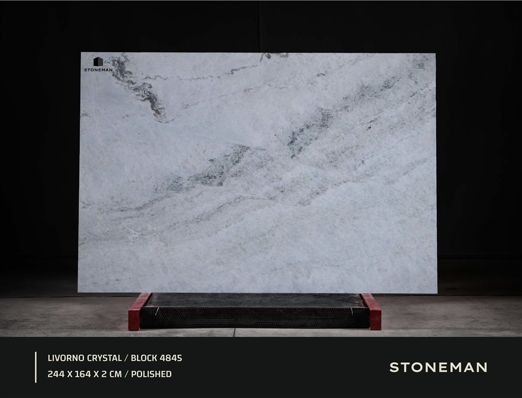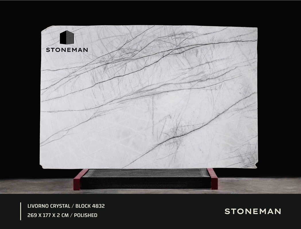 Камень Livorno Crystal (Ливорно Кристалл) предлагает классический и очень шикарный вид благодаря своему блестящему белому фону. Поверхность покрыта тонкой, художественной сеткой из узких прожилок темно-серого и черного цветов. Эти линейные и иногда пересекающиеся прожилки придают камню динамичный, но сбалансированный вид, делая его идеальным для современных и минималистичных пространств, стремящихся к элегантности.