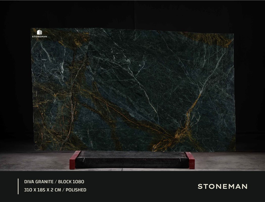 Гранит Diva — это драматичный шедевр природы. Его темный фон, варьирующийся от очень глубокого зеленого до черного, пронизан эффектными прожилками золотого, бронзового и светло-зеленого оттенков. Благодаря своему сложному и роскошному рисунку, этот камень идеально подходит для создания великолепных и художественных пространств, таких как стены вестибюлей или уникальные столешницы.