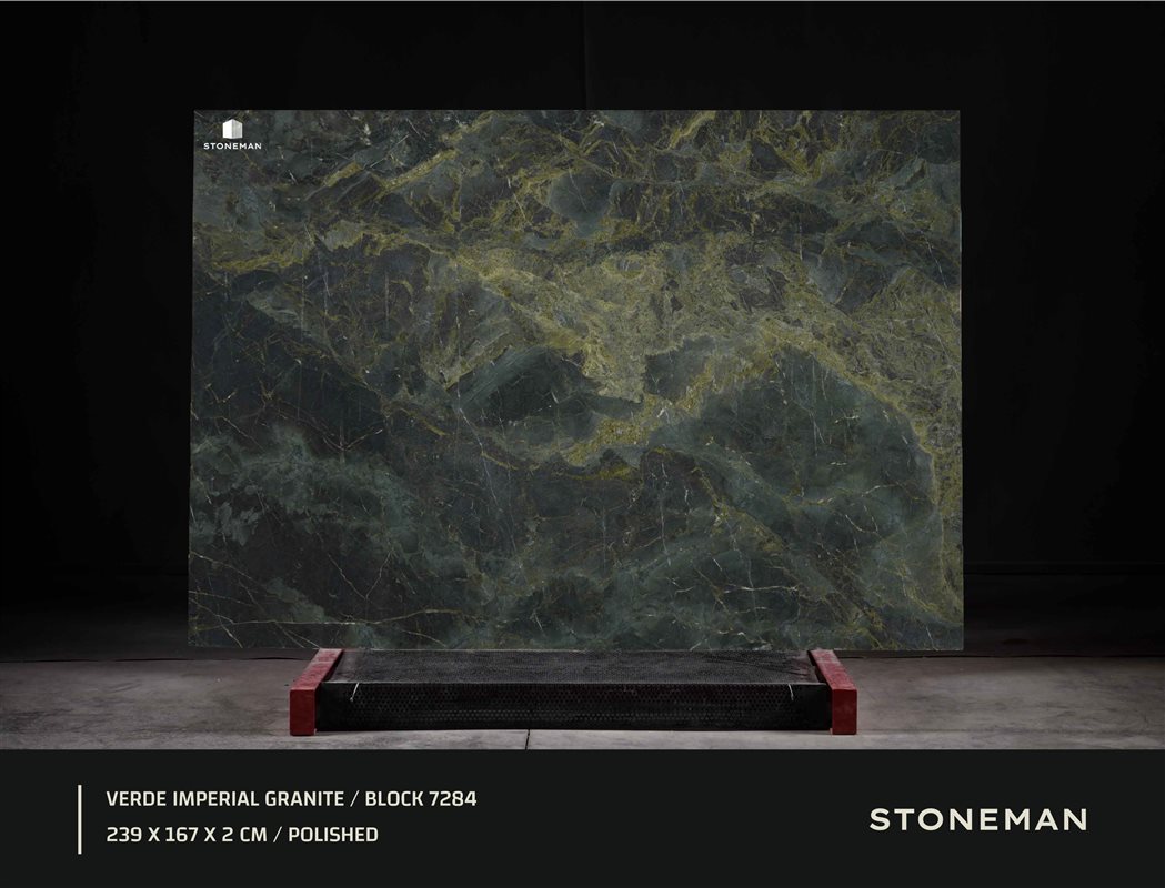 Гранит Verde Imperial (Императорский Зеленый) вызывает ощущение природной красоты и спокойствия древних лесов. Он отличается дымчатым, темно-зеленым фоном, смешанным с облачными пятнами более светлого оливково-зеленого и золотого цветов. Тонкие, переплетенные прожилки добавляют глубины, делая его идеальным для полов, столешниц или ванных комнат, где требуется естественный и элегантный акцент.