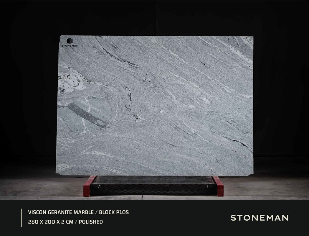 Гранит Viscon (Вискон) известен своим бело-светло-серым фоном с широкими, плавными волнами темно-серого и черного цветов. Рисунок напоминает движение облаков или дыма, создавая прекрасный контраст между светом и тьмой. Это популярный выбор для столешниц и стен, где требуется современная, но естественная эстетика.