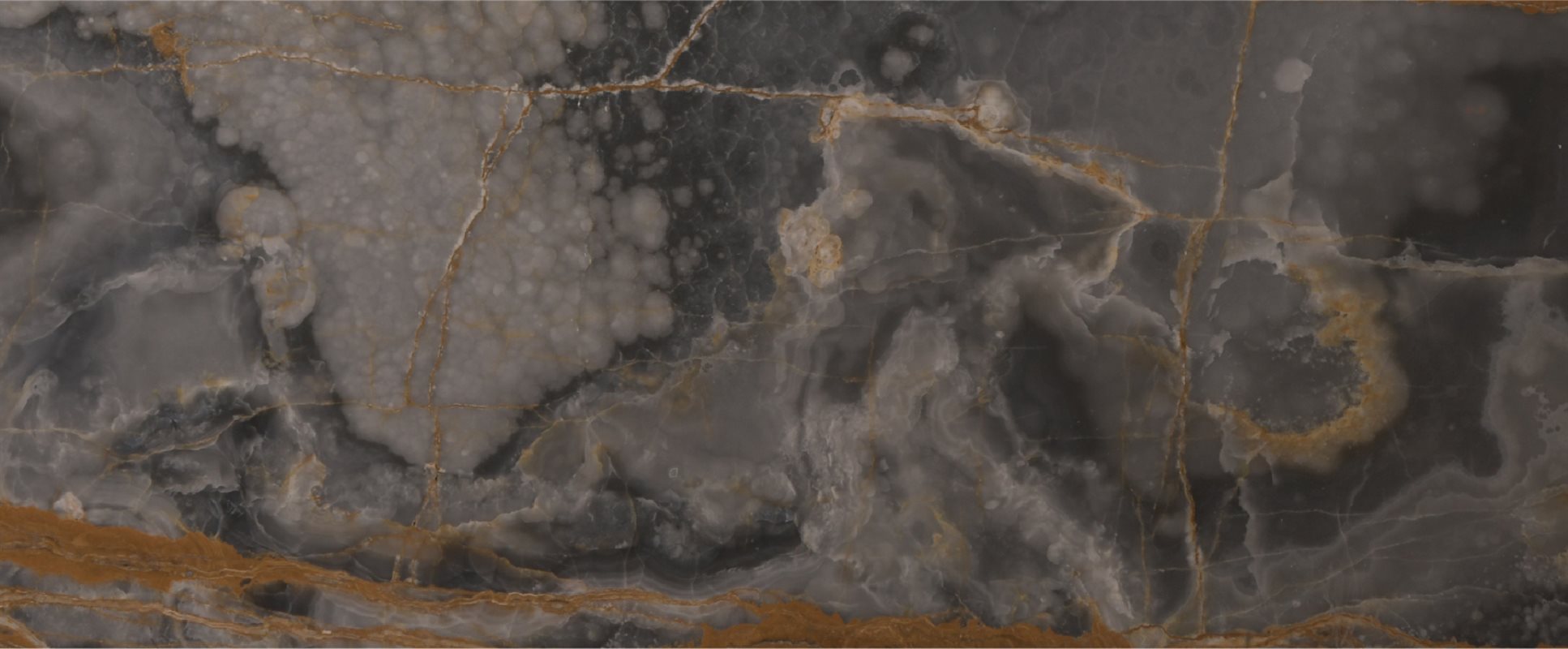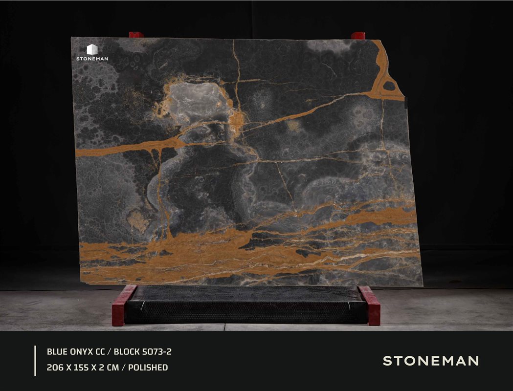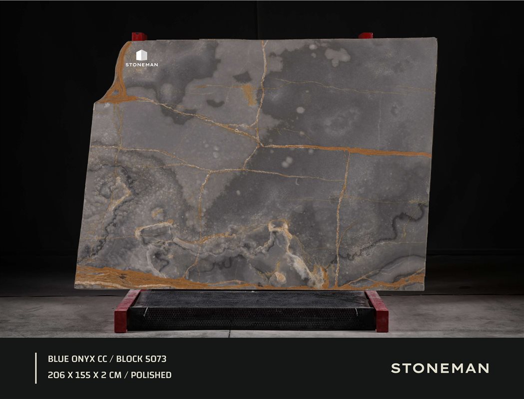 Blue Onyx (Синий Оникс) — это драматичный камень с дымчатым сине-серым полупрозрачным фоном. Облачные узоры белого цвета и яркие золотисто-коричневые прожилки создают потрясающий контраст. Его способность пропускать свет, особенно рядом с золотыми прожилками, придает ему кинематографическую глубину и привлекательность, делая его идеальным для акцентных стен с задней подсветкой.