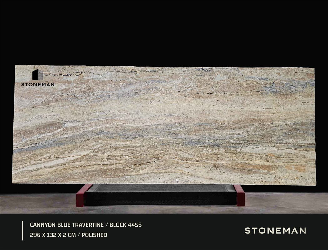 Travertine Canyon Blue (Каньон Блю) — this is a unique stone with a smooth, horizontal layered pattern, reminiscent of the walls of natural canyons. It demonstrates a beautiful combination of neutral colors, such as beige, cream and gray, with accented blue-gray veins and notes of olive-green. This calm, but dynamic color palette makes it ideal for indoor and outdoor spaces where an expressive and natural look is required.